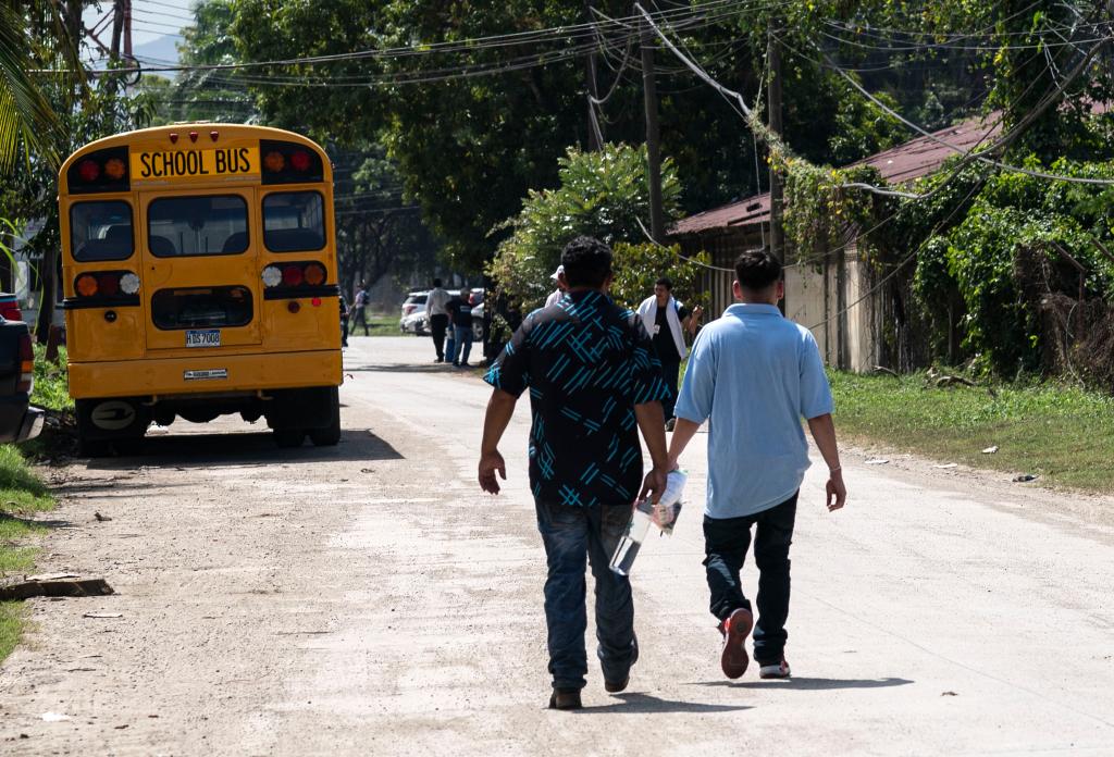2月14日,在洪都拉斯西北部城市圣佩德罗苏拉,两名返乡移民步行离开返乡移民援助中心。新华社发(戴维 摄)