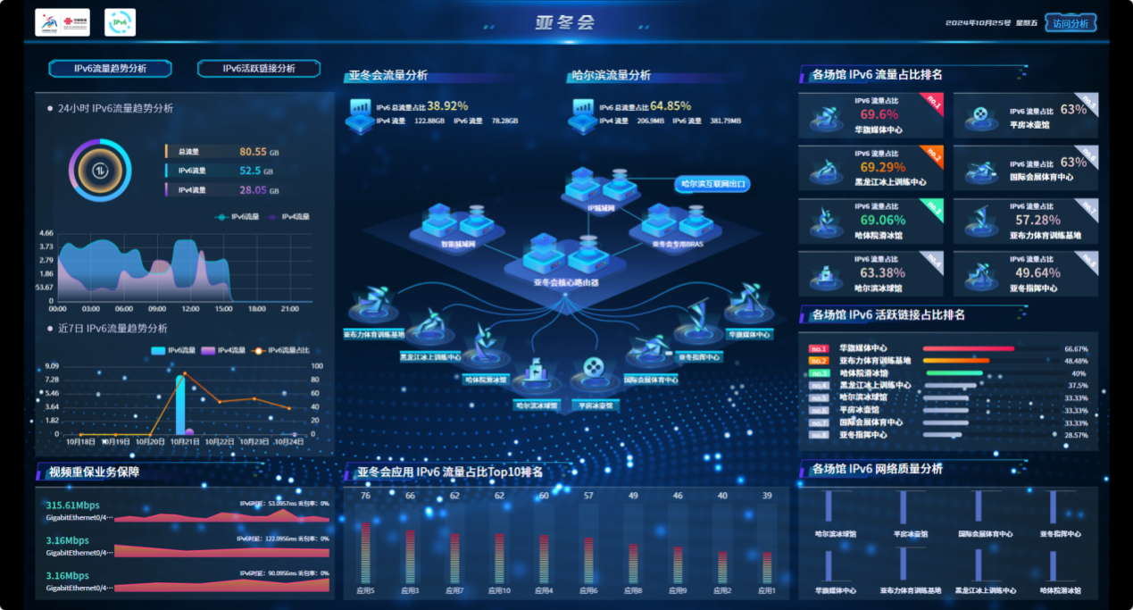 打造“智能亚冬”。中国联通创新性构建了智能化运维体系,下沉场馆的亚冬保障系统实现了全网态势分钟级监控;网络重保机器人集AI诊断、自动优化于一体,可自主生成优化方案并实时执行,确保网络时刻处于最佳状态,闭幕式期间,重保机器人自主处置网络波动23次、平均修复时间仅58秒;基于5G室内定位功能,可以实时查看场馆运维保障人员位置,通过5G网络形成“保障力量图”,从而快速调度人员迅速到达现场,提高了应急响应速度,保障了赛事顺畅进行。