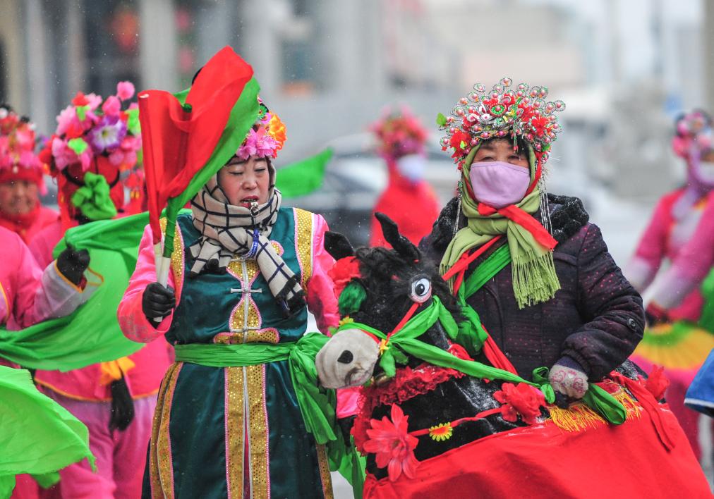 内蒙古通辽市扎鲁特旗,秧歌队在街头表演。新华社记者 彭源 摄