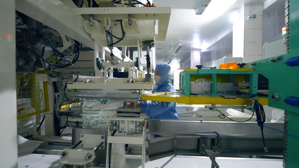 在内蒙古扎兰屯市某企业车间内,玉米被加工成味精后进行封装。(新华社发)