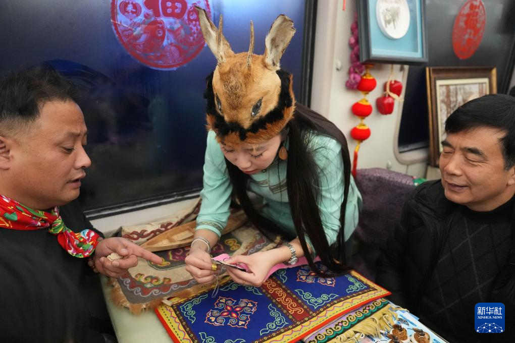 鄂伦春族非物质文化遗产县级传承人刘金鑫(中)在哈尔滨开往漠河的K7041次列车车厢中为旅客展示鄂伦春刺绣(2025年1月11日摄)。新华社记者 王松 摄