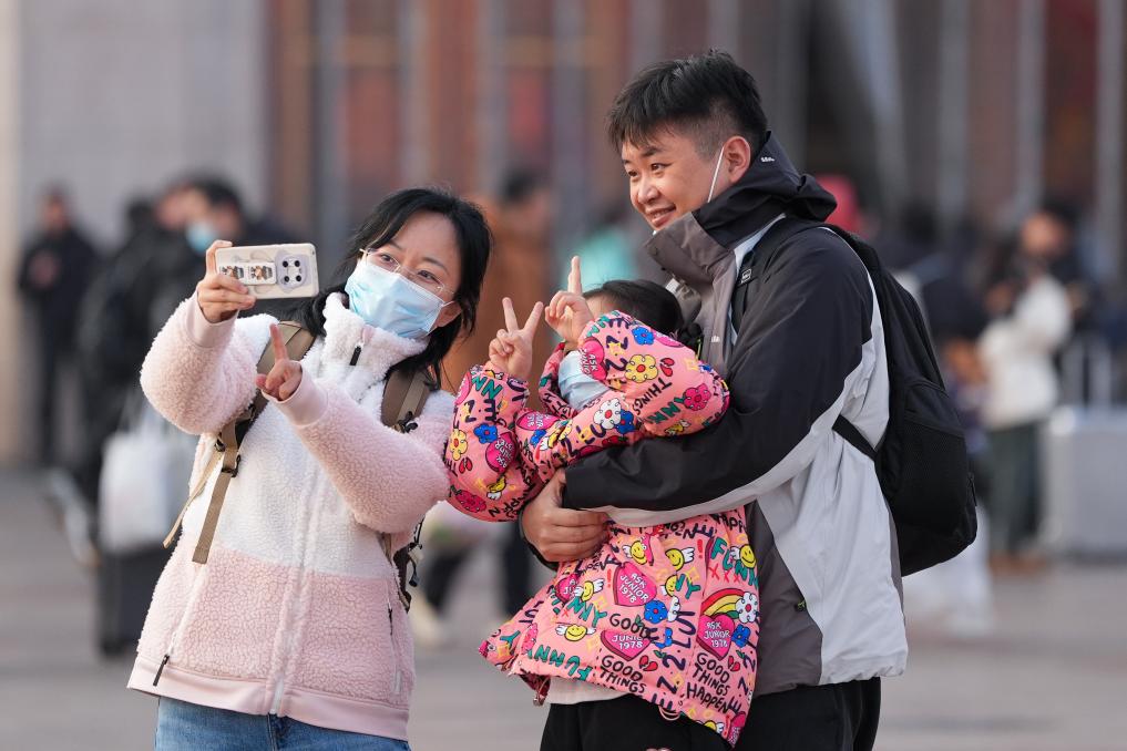 1月24日,一名小朋友(中)在北京站广场上和家人拍照留念。新华社记者鞠焕宗 摄