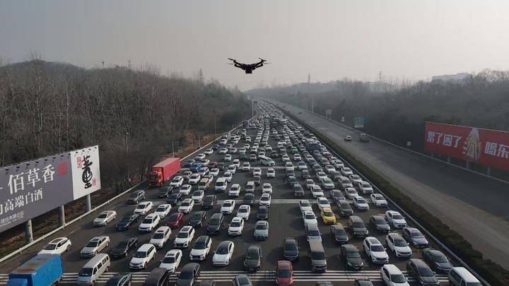 春运期间,沪宁高速公路南京段无人机巡航画面。新华社发