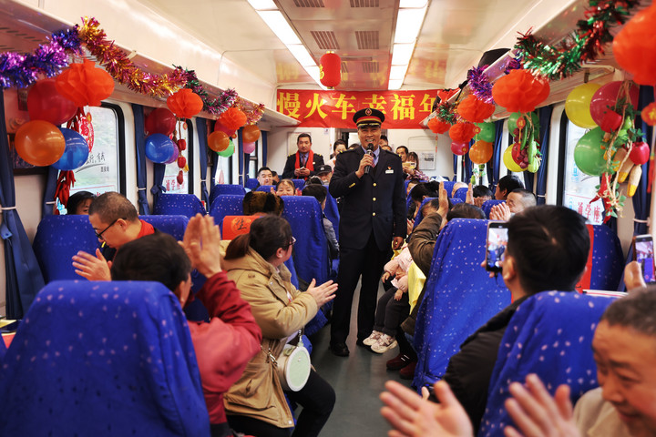 春运期间,6063次慢火车为沿线老乡举办新年庆祝活动。新华社发