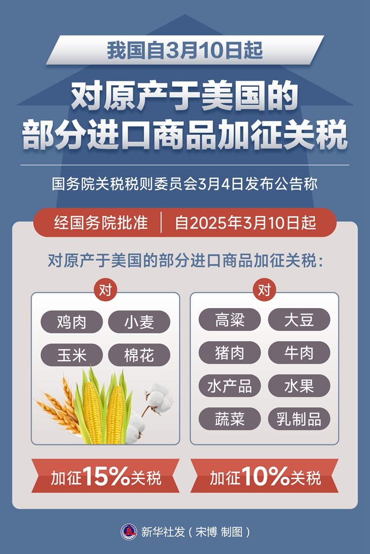 新华社北京3月4日电 国务院关税税则委员会4日发布公告称,经国务院批准,自2025年3月10日起,对原产于美国的部分进口商品加征关税:对鸡肉、小麦、玉米、棉花加征15%关税;对高粱、大豆、猪肉、牛肉、水产品、水果、蔬菜、乳制品加征10%关税。
