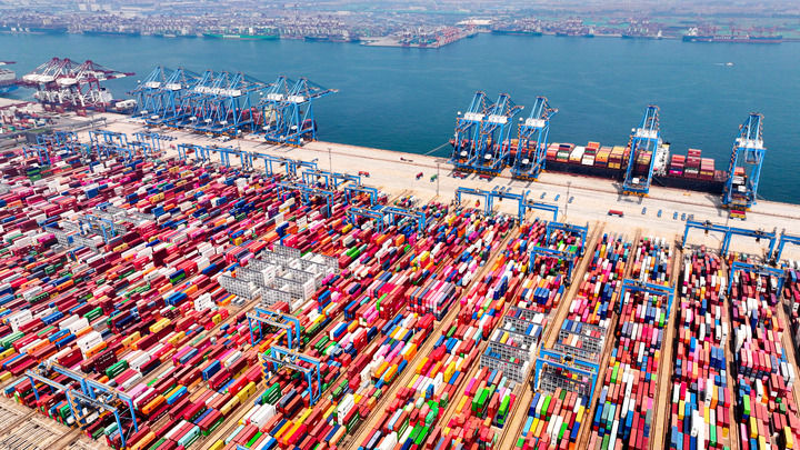 轮船在山东港口青岛港全自动化集装箱码头停泊作业(2024年7月3日摄)。新华社记者 郭绪雷 摄