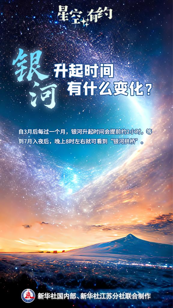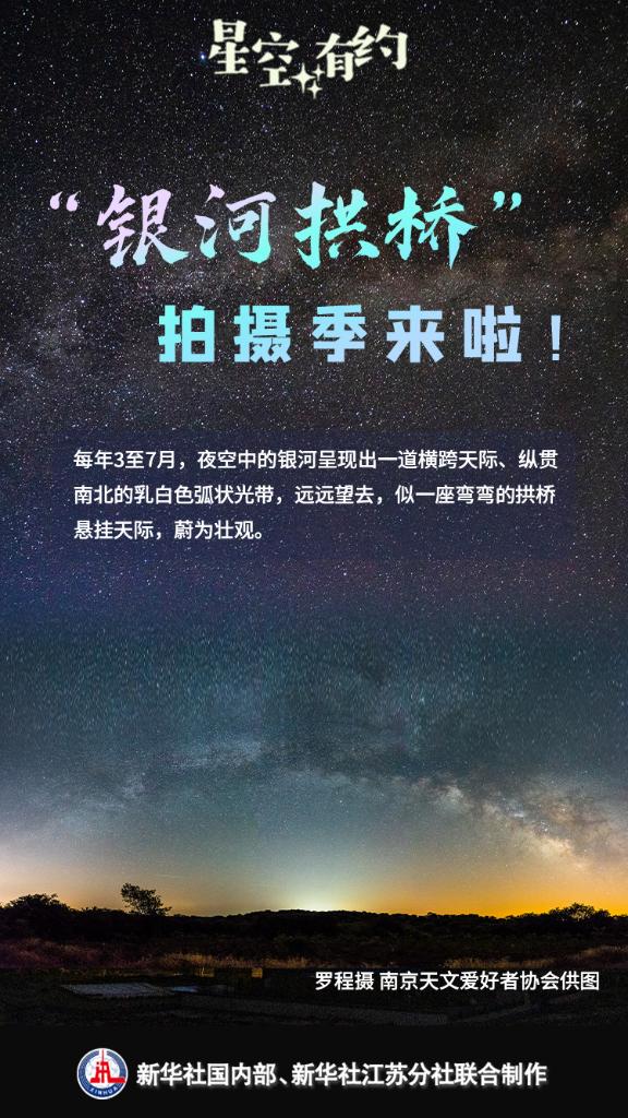 新华社南京3月13日电(记者王珏玢、朱筱)天气渐暖,天空中灿烂的“银河拱桥”也迎来5个月左右的最佳观赏和拍摄季。每年3至7月,我们有机会看到银河从东方地平线上升起时的景象,这时夜空中的银河呈现出一道横跨天际、纵贯南北的乳白色弧状光带,远远望去,似一座弯弯的拱桥悬挂天际,蔚为壮观。