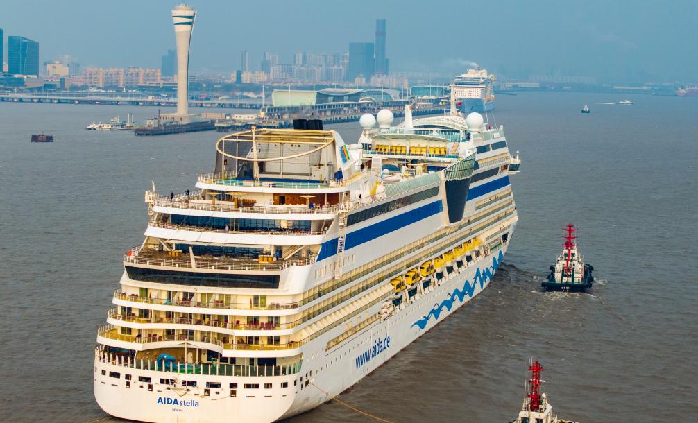 3月16日,“阿依达·星辰号”邮轮航行在上海吴淞口国际邮轮港水域(无人机照片)。新华社发 朱嘉奕 摄