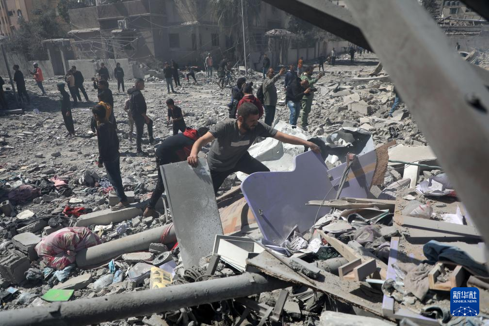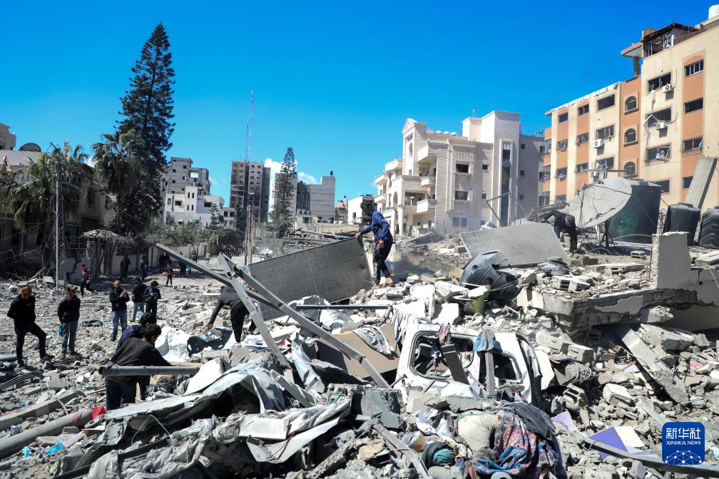 3月19日,在加沙地带北部加沙城的一处社区,人们在以军袭击后的废墟中搜寻。新华社发(里泽克·阿卜杜勒贾瓦德摄)