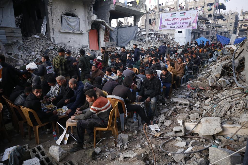 2025年3月1日,在加沙地带北部杰巴利耶的废墟上,巴勒斯坦人在斋月的第一天共进开斋饭。新华社发(马哈茂德·扎基摄)