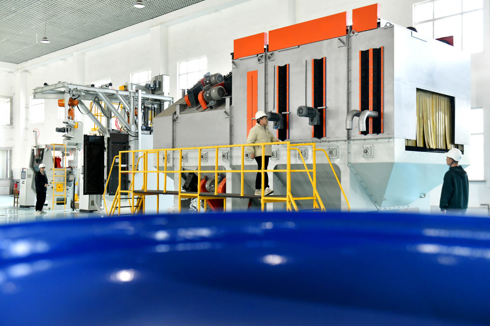 2025年3月17日,在山东开泰集团智能抛喷技术研究院,工作人员在调试机械设备。新华社记者 郭绪雷 摄
