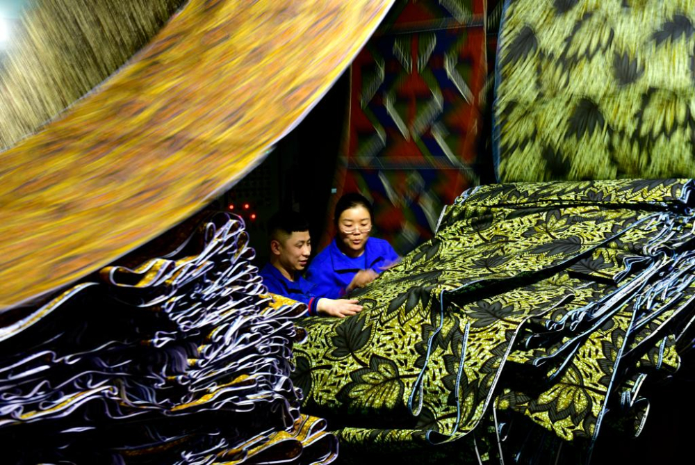 2025年2月25日,在位于山东省滨州市的愉悦家纺有限公司蜡染车间,工作人员在查看出口布匹。新华社记者 郭绪雷 摄