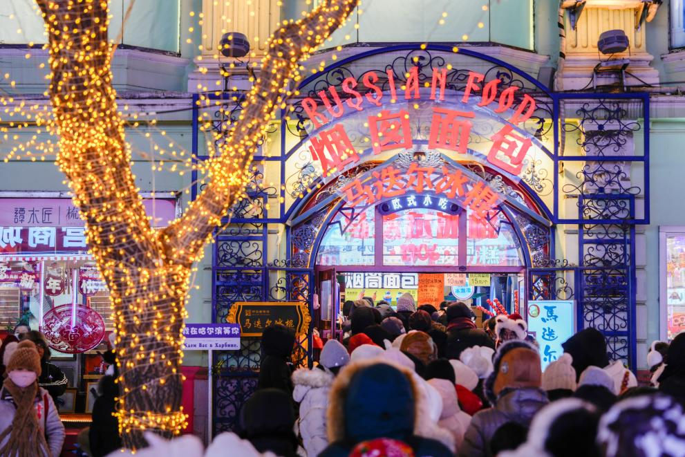 2025年1月30日,游客在哈尔滨中央大街上排队购买美食。新华社记者王建威摄