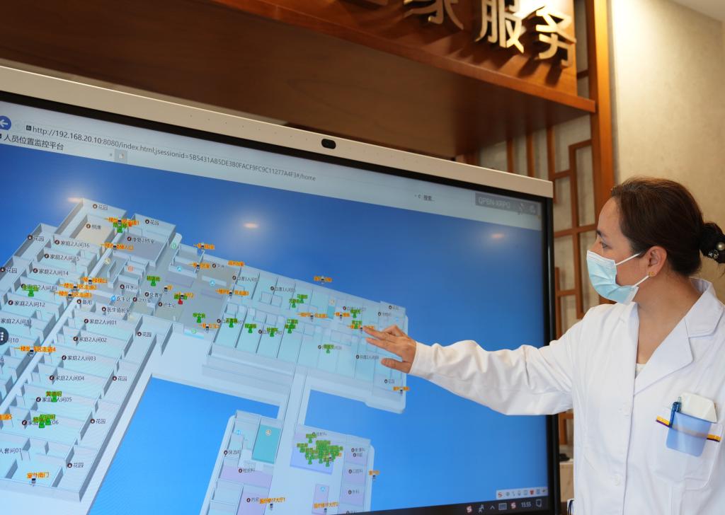 4月8日,在江苏无锡滨湖区一养老院,工作人员通过护士站里的人员位置监控平台确定院内老人位置。