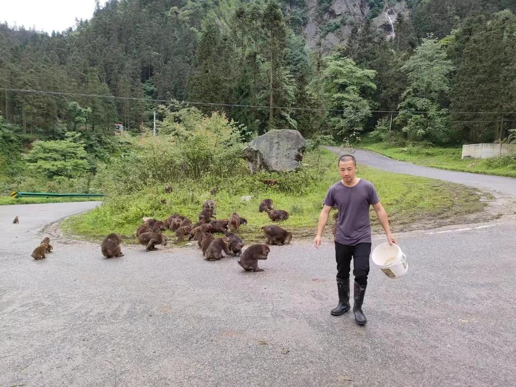 新华社成都4月22日电(记者赵怡宁)清晨,山间凉风习习,唐海走出家门,在自家小院里提了一口气,大声吆喝“猴儿,猴儿……”,十几分钟后,一群毛色灰棕的藏酋猴拖家带口地从山上奔走下来,双手抱握胸前端坐着,等待唐海拿出玉米粒来喂。