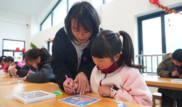 2月21日,重庆市丰都县包鸾镇“鸾妈妈”青少年家庭教育互助会志愿者在辅导孩子制作钻石画。丰都县委宣传部提供。