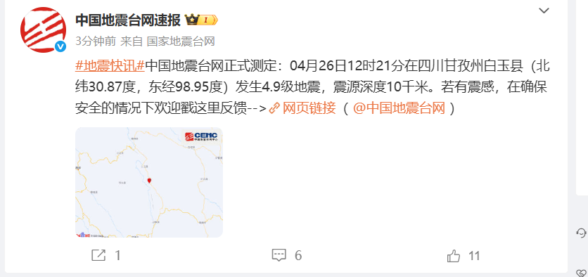 中国地震台网正式测定:04月26日12时21分在四川甘孜州白玉县(北纬30.87度,东经98.95度)发生4.9级地震,震源深度10千米。