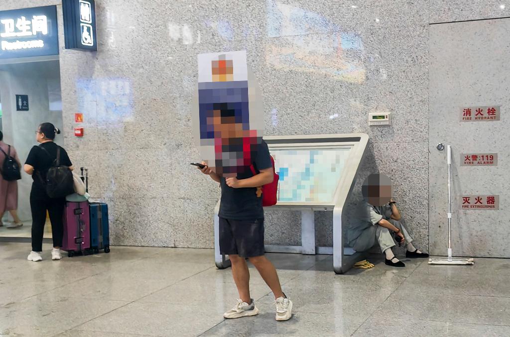 在广西某市一处地下广场的卫生间附近,由于人流量较大,工作繁忙,保洁员(右一)只能在卫生间外的角落里临时休息(4月19日摄)。