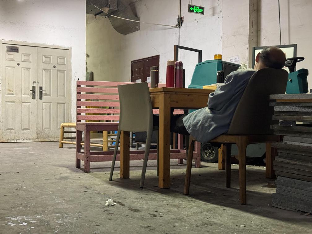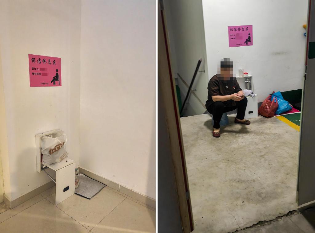 这是在广西某市一家商场拍摄的保洁员临时休息处(4月18日摄)。此外,该商场还为保洁员设置了固定休息室。