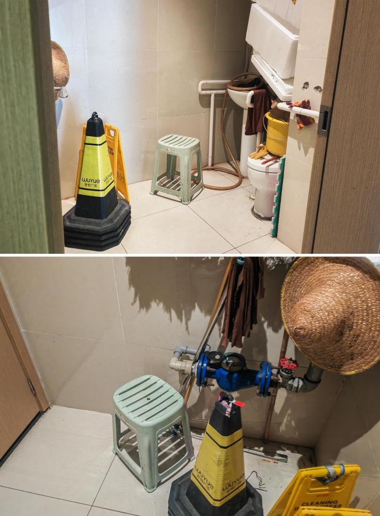 这是在广西某市一处商业街的无障碍卫生间,保洁人员把这里变成了工具间和休息室(4月18日摄,拼版照片)。