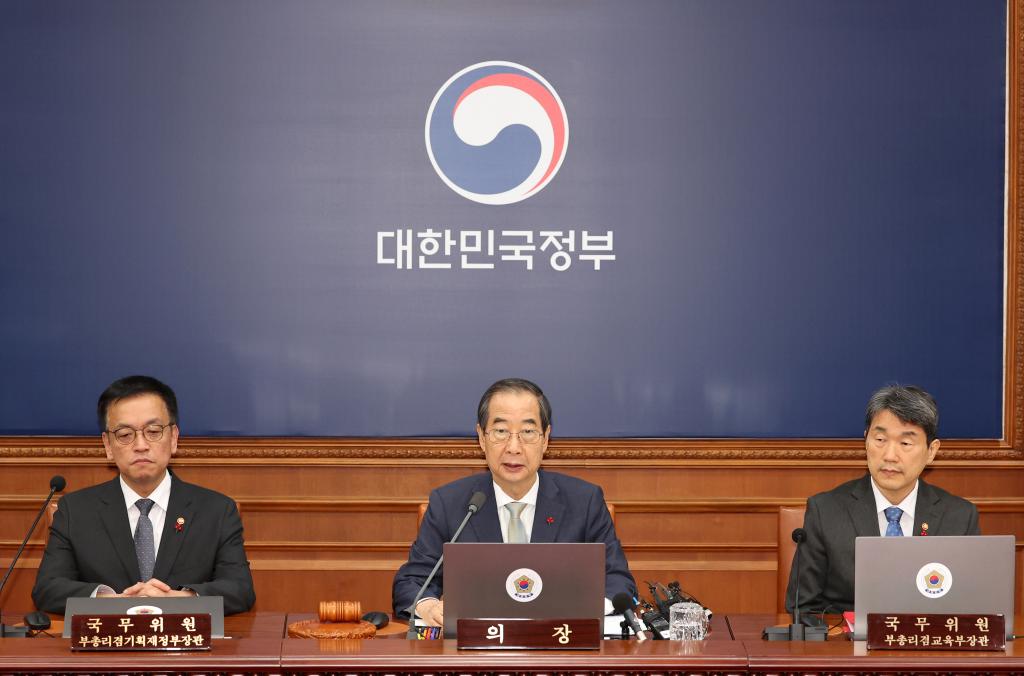 2024年12月14日,在韩国首都首尔,代行总统职权的韩国国务总理韩德洙(中)召开临时国务会议。新华社/纽西斯通讯社
