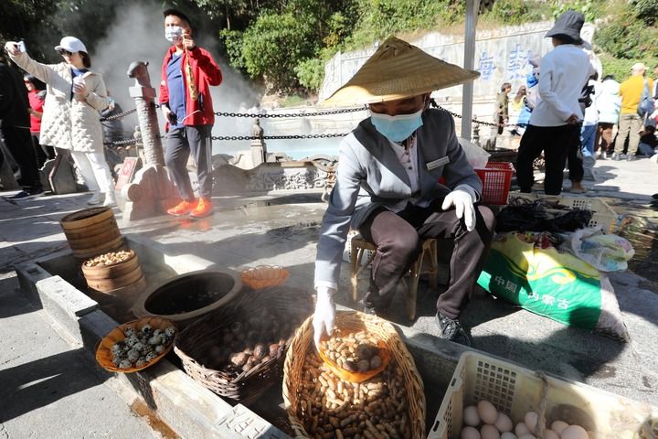 2023年1月22日拍摄的腾冲市热海温泉景区“地热厨房”,人们在此煮鸡蛋、蒸花生。新华社发(龚祖金摄)