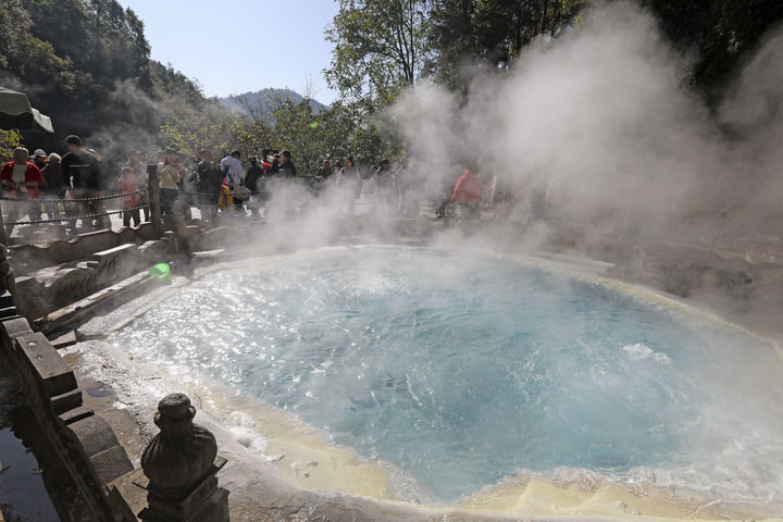2023年1月22日,游客在腾冲市热海温泉景区标志性景点“热海大滚锅”游玩。新华社发(龚祖金摄)