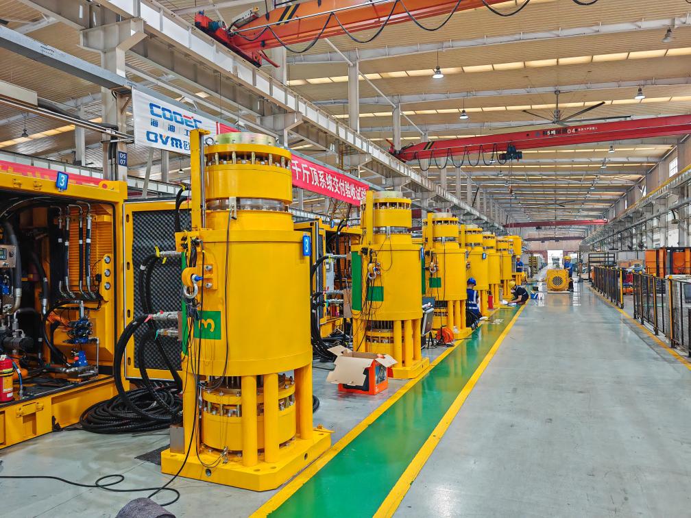 我国自主研制首套5万吨级拉力千斤顶牵引装船系统成功交付。(海油工程供图)