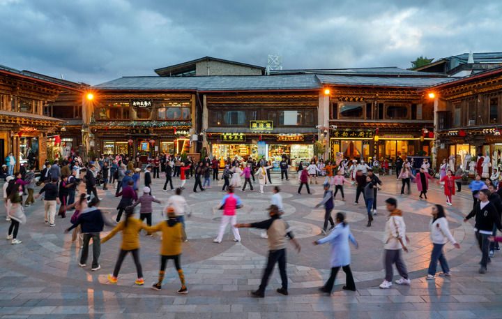 游客和当地群众在云南省迪庆州香格里拉市独克宗古城里一起跳舞(2024年9月27日摄)。新华社记者 王静颐 摄
