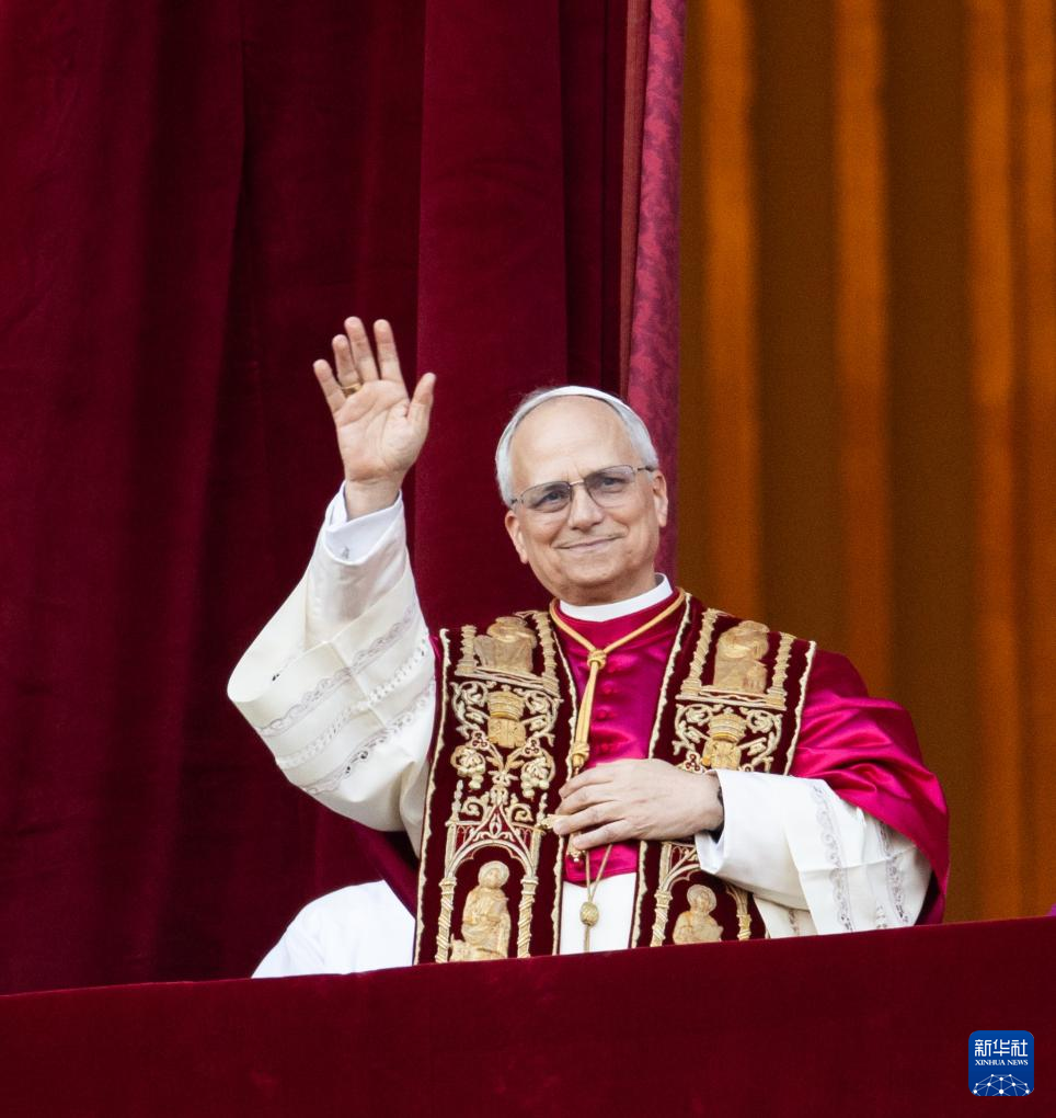 5月8日,在梵蒂冈城,来自美国的枢机主教罗伯特·普雷沃斯特当选新一任天主教罗马教皇后向民众致意。新华社记者 李京 摄