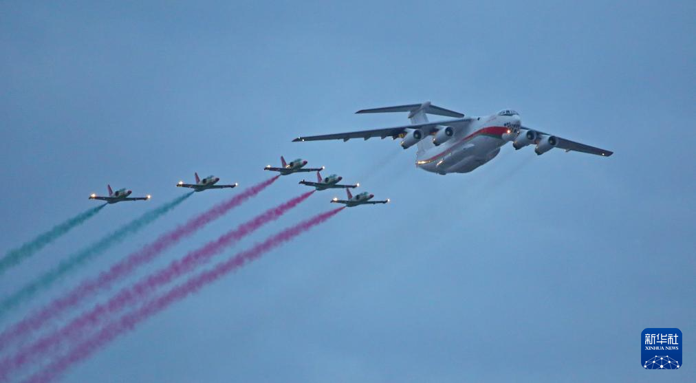 5月9日,在白俄罗斯首都明斯克,空中编队参加纪念苏联伟大卫国战争胜利80周年阅兵式。新华社发(任科夫摄)