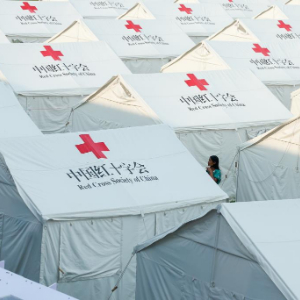 这是位于缅甸曼德勒城内足球场的一个地震灾民安置点,数十个白色救灾帐篷整齐搭建在绿茵茵的足球场上,帐篷顶上的“中国红十字会”字样格外醒目。