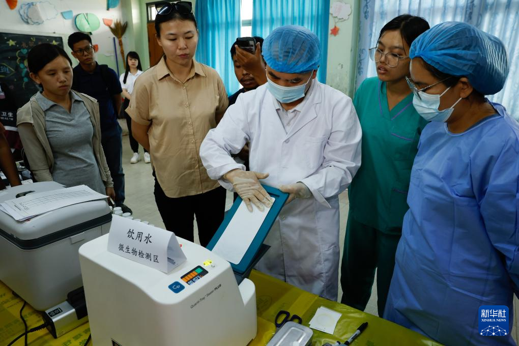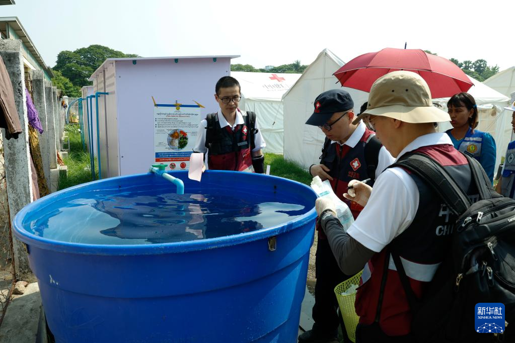 5月9日,在缅甸曼德勒,中国防疫队对一处地震灾民安置点生活用水进行采样。新华社发(苗觉梭摄)
