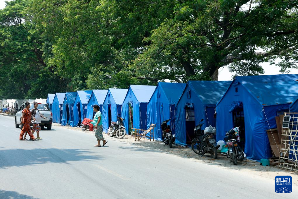 这是5月10日在缅甸曼德勒一处地震灾民安置点拍摄的中国援助的救灾帐篷。新华社发(苗觉梭摄)