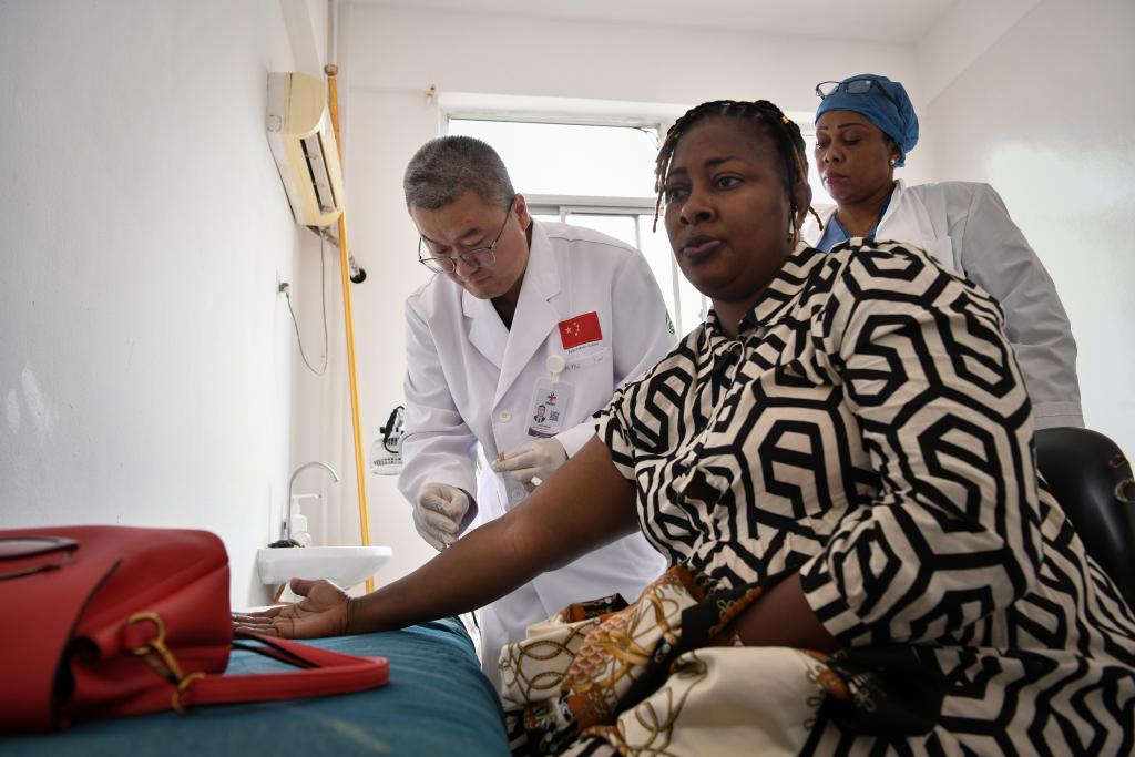 2025年4月29日,在位于几内亚首都科纳克里的中几友好医院,中国医疗队医生刘路遥为患者做针灸治疗。新华社记者韩旭摄