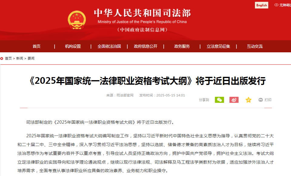 记者5月15日从司法部获悉,司法部制定的《2025年国家统一法律职业资格考试大纲》将于近日出版发行。