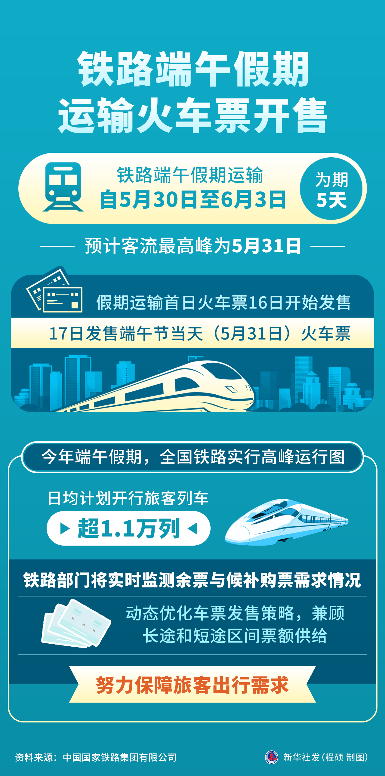 国铁集团客运部负责人介绍,今年端午假期,全国铁路实行高峰运行图,日均计划开行旅客列车超1.1万列。铁路部门将实时监测余票与候补购票需求情况,动态优化车票发售策略,兼顾长途和短途区间票额供给,努力保障旅客出行需求。