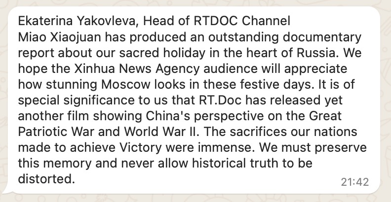 “今日俄罗斯”电视台在社交媒体Telegram平台推介纪录片俄文版。