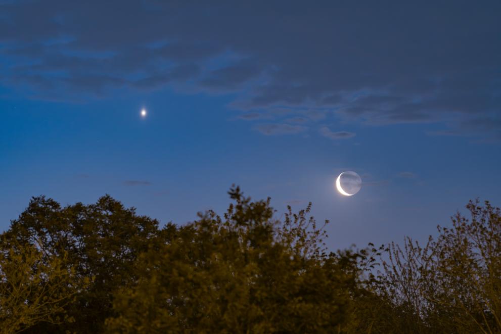 2025年4月25日在北京亦庄拍摄的金星伴月。(马劲 摄)