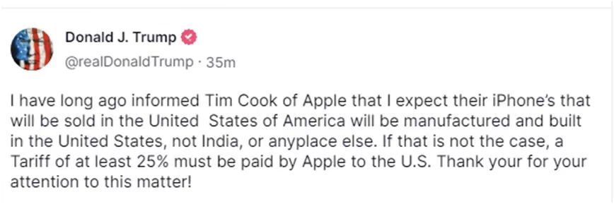 针对苹果,特朗普说,他“很早之前就告诉过苹果公司的(首席执行官)蒂姆·库克,我希望他们在美国销售的苹果手机是在美国生产和制造,而不是在印度或者其他什么地方”,“如果不是这样的话,苹果公司必须向美国支付至少25%的关税”。
