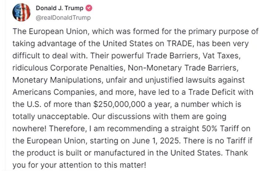 他说,美欧之间的磋商停滞不前。“因此,我建议自2025年6月1日起,对欧盟商品统一征收50%关税。若产品在美国本土生产制造,则免征关税。”