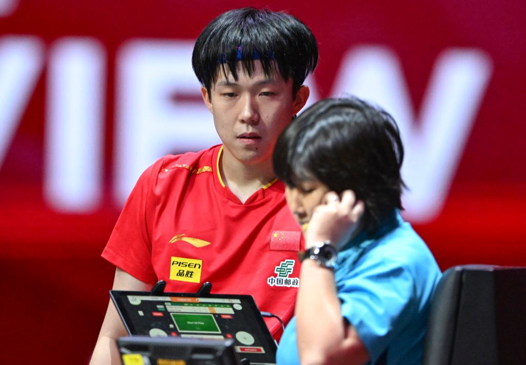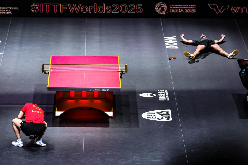 而梁靖崑呆站在原地,低头凝视球拍,脸上布满不甘与遗憾,指尖无意识地摩挲胶皮。