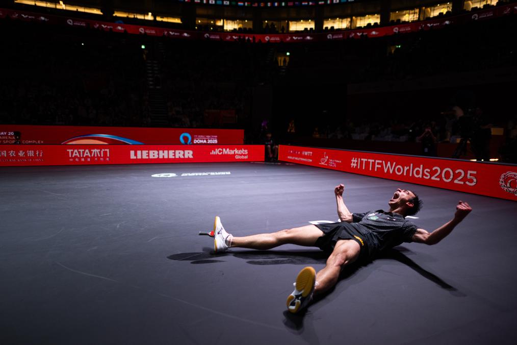 雨果张开大嘴,仰天长啸,双臂张开,地板上映出他的狂喜,他的拳头一次次捶向空气,吼声穿透场馆的穹顶——这是属于巴西人的第一次世乒赛男单决赛入场券,镜头里每一瞬都写满历史的震颤。