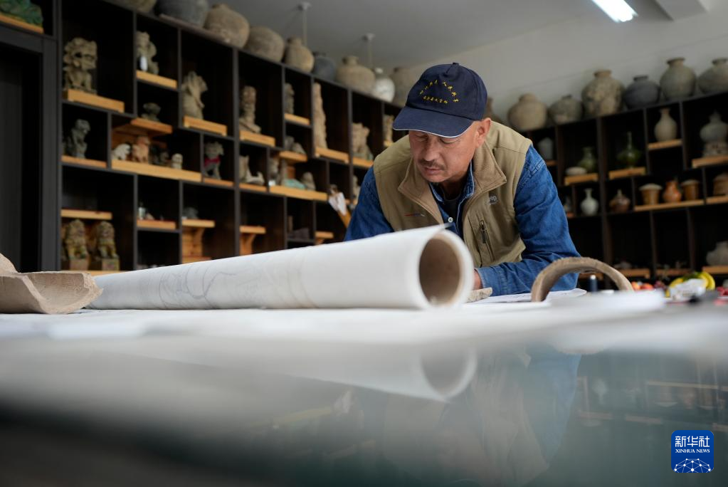 5月12日,李世翔在海原县博物馆旁的工作室中整理图纸(林漫是他的笔名)。