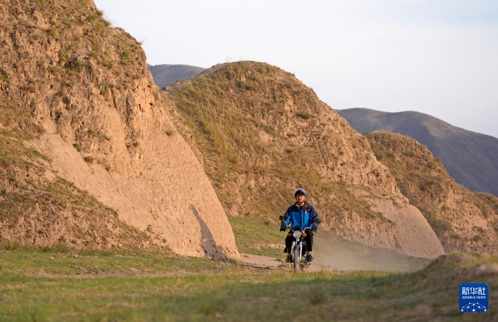 5月11日,李世翔骑摩托车巡查位于海原县的全国重点文物保护单位——柳州城址。