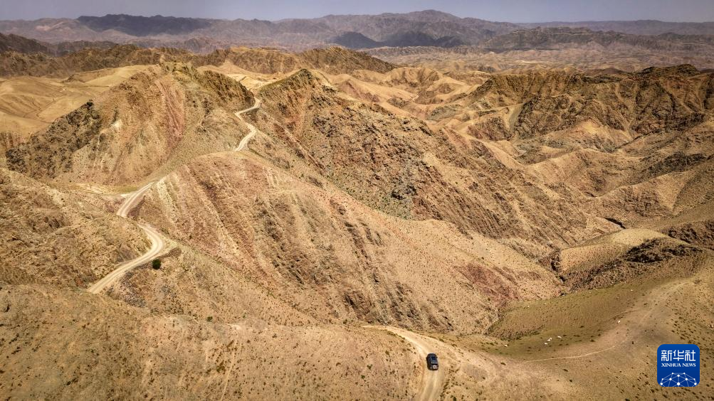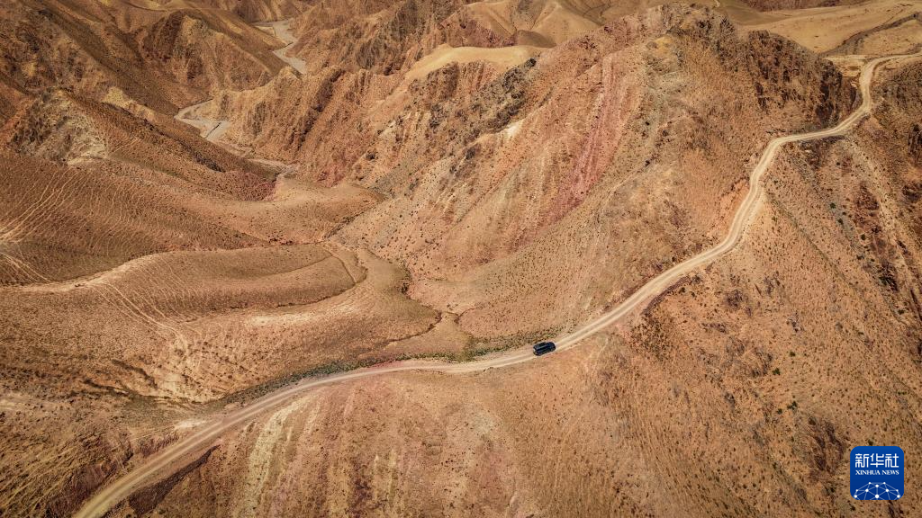 5月13日,李世翔驾车前往黄河黑山峡考察途中经过一段崎岖的山路(无人机照片)。