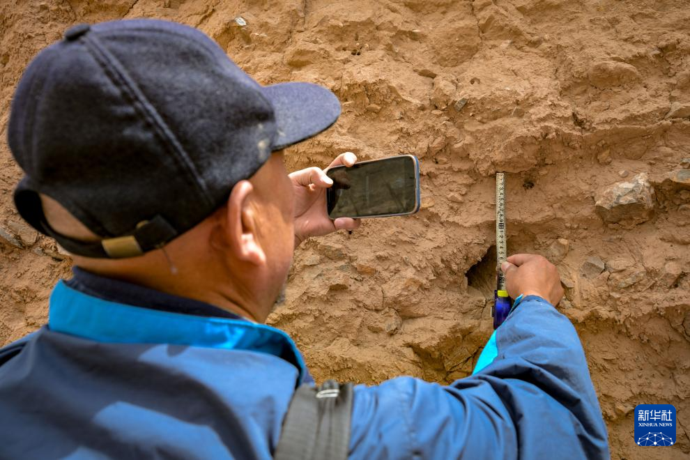 5月13日,李世翔在黄河黑山峡考察途中测量一处秦长城夯土层。