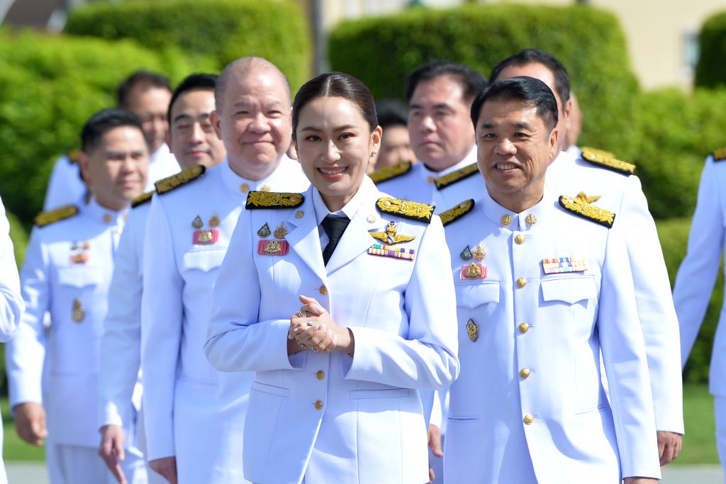 2024年9月7日,泰国总理佩通坦·钦那瓦(前中)及新一届内阁成员在位于首都曼谷的总理府与媒体见面。新华社发(拉亨摄)