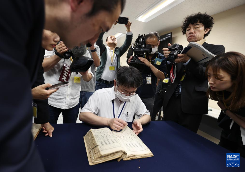 5月14日,在日本东京,工作人员在日本国立公文书馆翻阅侵华日军细菌战部队“登字1644部队”留守名簿,寻找写有竹上胜利父亲宫下利市的文字记录。新华社记者 贾浩成 摄