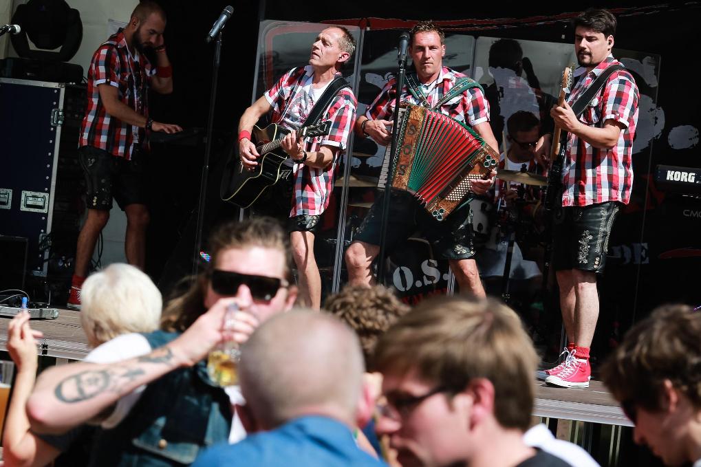 2016年8月6日,在德国柏林举办的啤酒节上,人们边喝啤酒边欣赏音乐演出。新华社记者张帆摄